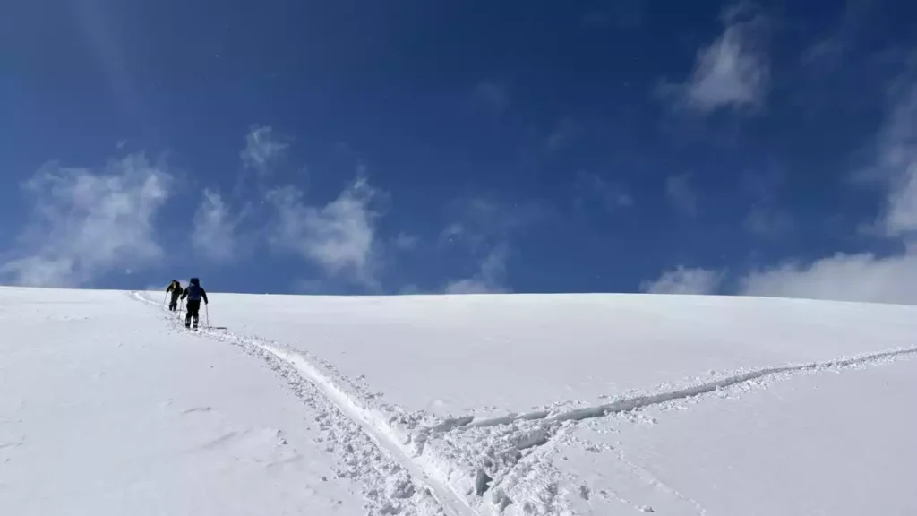 高度が上がるにつれて斜度も増し、息が上がる場面もありましたが、パウダーのフカフカな雪面のおかげで足元が滑ることなく、意外と歩きやすかったのが印象的でした。時折、風が吹き抜ける稜線に近づくと冷たさが増しますが、天気は快晴で日差しも強く、体を動かしているうちに寒さは気にならなくなりました。